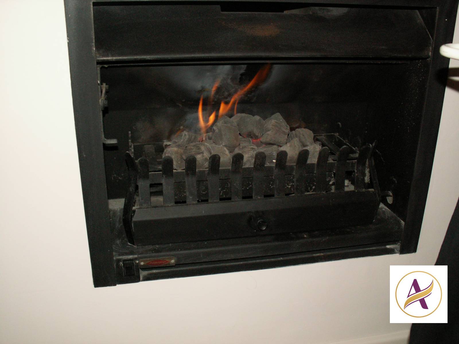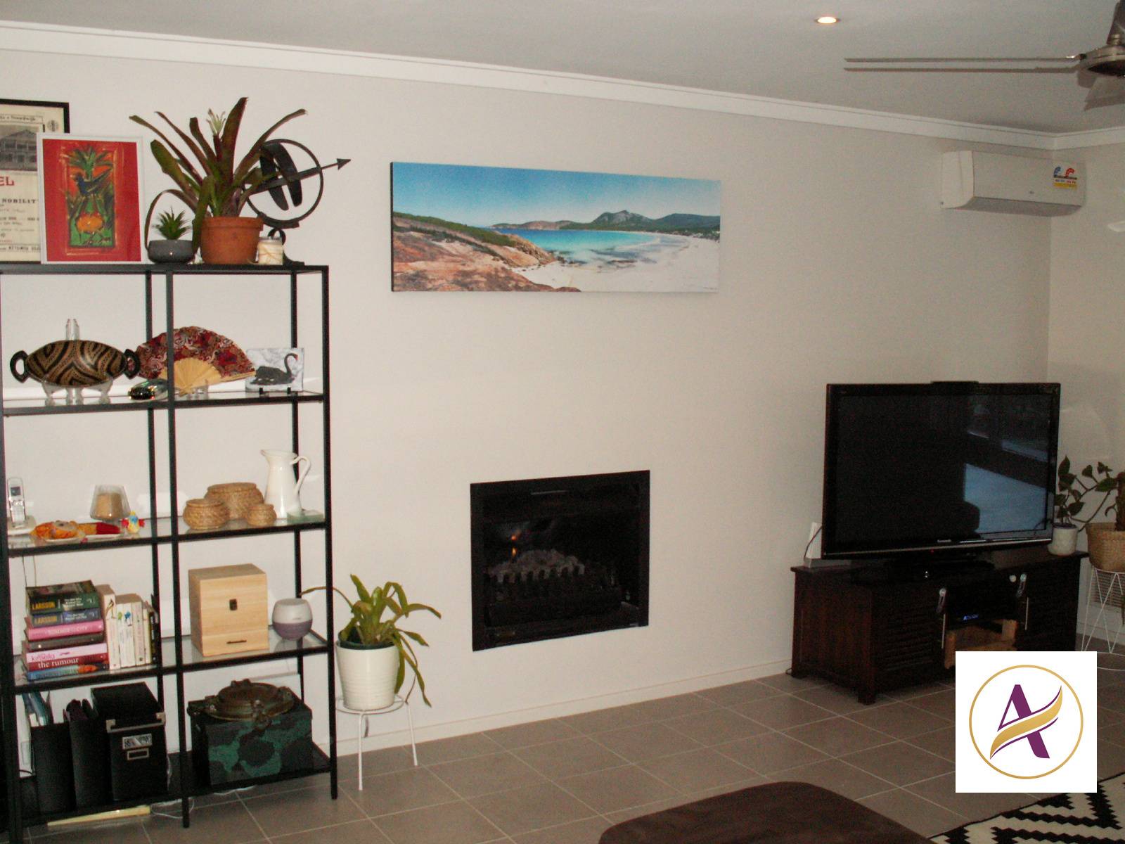 * Living area with gas wood fire, no chopping wood and ceiling fan